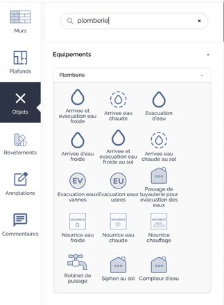 Vous pouvez retrouver tous les éléments liés à la plomberie en tapant “Plomberie” dans la barre de recherche de l’onglet Objets à gauche de votre écran.